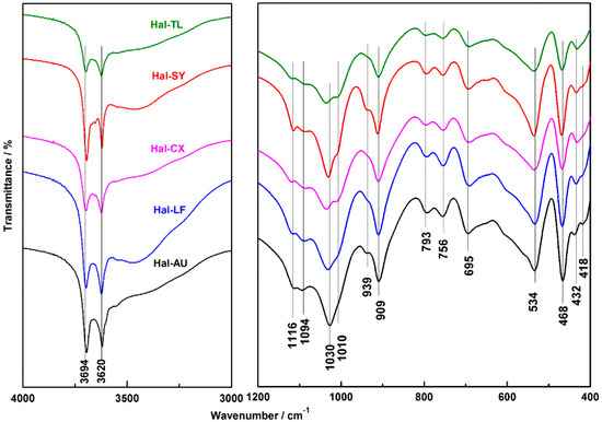 FTIR spectra of different halloysite minerals in the range 3000–4000 cm−1 and 400–1200 cm−1.