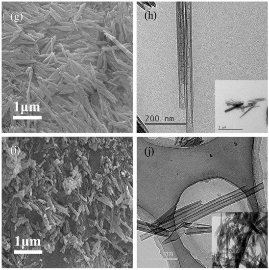 Halloysite (abbreviated as Hal) (Al2Si2O5(OH)4·2H2O) is a hydrated polymorph of kaolinite with a peculiar naturally occurring tubular clay mineral [1], where the layered [SiO4] and [AlO6] polyhedrons are arranged in a 1:1 style manner. Hal contains extra water molecules between the alumina/silica layers compared to kaolinite (Al2Si2O5(OH)4) [2]. The hydration of –Al–OH and –Si–OH groups reduces bonding interactions between the adjacent alumina/silica layers, which in combination with the mismatch of [SiO4] tetrahedron and [AlO6] octahedron lattices, drives the layers to bend and form a stereotypically hollow tubular morphology [3,4,5], although occasionally, halloysite minerals may show some distinctive forms such as spherical and platy ones [6]. The basal d (001) spacing of hydrated halloysite is 10 Å, which is larger than kaolinite (~3 Å). The interlayer water is weakly coordinated, so that the 10 Å-halloysite will be easily converted to 7 Å-halloysite (also known as meta-halloysite) through mild dehydration [7,8]. Furthermore, the exterior and interior surfaces of Hal are composed of siloxane (Si–O–Si) groups and a gibbsite-like array of aluminol (Al–OH) groups, respectively, resulting in a negatively charged outer surface and the positively charged inner surface in the pH range 2.0~8.0 [2]. The average diameter of interior lumen is 15~20 nm, and that of the outer diameter is 50~80 nm, length of the tubes will vary from 100 nm to 1500 nm or more. The reported maximum specific surface area of Hal reached 156 m2/g [8].
