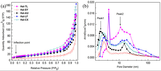 (a) N2 adsorption-desorption isotherms and (b) pore size distributions of the Hal samples.