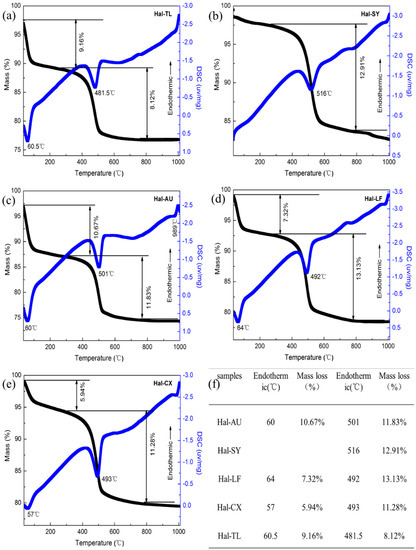 TG and DSC results for halloysite samples (a) Hal-TL; (b) Hal-SY; (c) Hal-AU; (d) Hal-LF and (e) Hal-CX; the table in (f) is the detailed parameters of each stages of thermal behaviors.