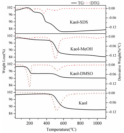 - Matusik, J.; Kłapyta, Z. Characterization of kaolinite intercalation compounds withbenzylalkylammonium chlorides using XRD; TGADTA and CHNS elemental analysis. Appl. Clay Sci. 2013, 83–84, 433–440. [Google Scholar] [CrossRef]