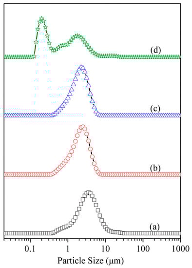 | Samples | D10 (µm) a | D50 (µm) a | D90 (µm) a | Daverage (µm) |