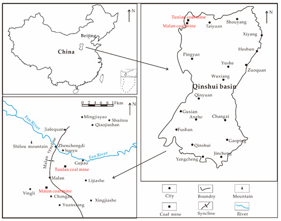 The tested coal samples were retrieved from coal seam #3 of the lower Triassic Shanxi formation in the Malan and Tunlan coal mines. Both mines are located in the Gujiao block of the Xishan coalfield in the northwestern Qinshui basin of Shanxi Province, China (Figure 1). Before the beginning of the experiments, all samples were oven-dried at a temperature of 110 °C for 12 h.