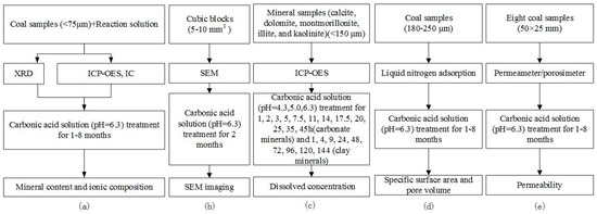 To simulate the weakly acidic fluid formed by the dissolution of CO2 in mine water, reaction solutions were prepared from dry ice and distilled water. Six different types of experiments were conducted in this study following the procedures described in Figure 2. (1) X-ray diffraction (XRD) measurements were performed to determine the mineral compositions of the coal samples before and after CO2 injection; (2) During the acidification stage, the content of each ion type was affected by the reaction between the solid coal and the solution, therefore, the concentration of each ion in solution was measured before and after treatment; (3) To investigate the pore structures of the coal samples before and after acidification, scanning electron microscopy (SEM) studies was conducted. (4) To determine which particular mineral plays a prominent role in the chemical reaction at different stages, the reaction rate and time required to reach equilibrium were measured for each mineral under various temperature and pressure conditions; (5) Specific surface areas, pore volumes, and pore diameter distributions of the tested samples were measured/calculated at different times during acidification by performing low-pressure nitrogen gas adsorption studies; (6) Permeability tests were performed by conducting fluid flooding experiments at different stages of the acidification process.
