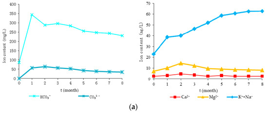 CO2 injection was accompanied by the changes of the ion concentrations in the reaction solution. To investigate possible reactions of the major minerals in the coal samples, the corresponding variations of the main ions in solution (K+, Na+, Ca2+, Mg2+, HCO3−, and CO32−) were measured (Figure 3). The concentrations of K+ and Na+ ions in the reaction solutions of the Malan coal samples increased with time from the initial value of 23.05 mg/L to 78.82 mg/L, while the concentrations of Ca2+ ions initially increased and then decreased, reaching a peak value of 4.89 mg/L after 2 months of reaction after the reaction with CO2-water. The overall changes in Mg2+ concentration were similar to those of Ca2+ ions, reaching a peak value of 14.58 mg/L after 2 months. Among the studied anions, changes in HCO3− concentration were greater than those in CO32− concentration, while both parameters exhibited an initial increase followed by a decrease. HCO3− content reached its largest value after 1 month of reaction.
