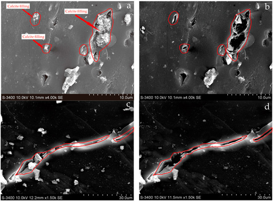 To visualise the effect of CO2 and water on microstructure of coal, a series of SEM images were taken from the surface of treated coal. Partial microfracture (>1 μm) images of coal samples before and after acidification obtained using SEM are presented in Figure 5. The pores and microfractures in the treated specimens were extended, multiplied than those in the initial coal samples. It could be demonstrated that acidification led to an increase in the average pore size and number of pores and microfractures. More minerals were dissolved to some extents in the pores and microfractures in the raw specimens. A similar result has been observed by Wen et al. [28] upon mineral dissolution and removal by CO2 treatment, with pore volume enlarged naturally.