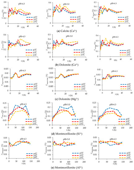 Dissolving-out ratio (P)–time profiles for dissolutions of calcite (a), dolomite (b,c), montmorillonite (d,e) in respective reaction solutions under different temperatures and pH values. Among clay minerals, montmorillonite was taken as an example in this figure, because of the similarity with the laws of ion dissolution rate curve in montmorillonite, illite and kaolinite.
