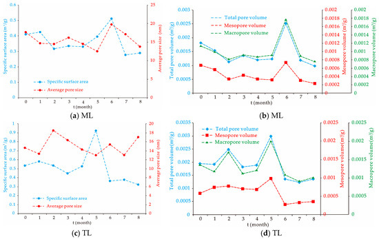 Dynamic of specific surface area (a,c) and pore volume (b,d) over time. ML represents Malan samples and TL represents Tunlan samples. Specific surface area was calculated through the BET method. Mesopore volume was calculated using the BJH method.