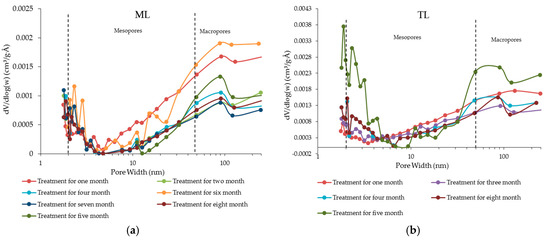 Distributions of BJH pore size for Malan (ML) and Tunlan (TL) samples before and after treatment: (a) ML and (b) TL.