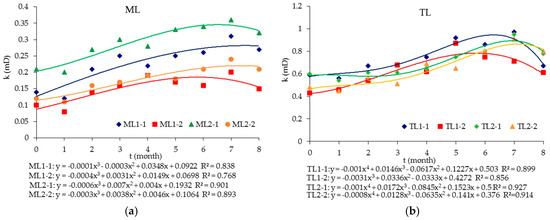 Permeability changes of Malan (ML) and Tunlan (TL) samples over time. The fitting formulas below dictate the permeability trends of all the samples: (a) ML and (b) TL.