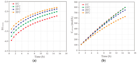 Saturation indexes (SI) for concentration of calcite and calcium at different temperatures: (a) SIcalcite and (b) Ccalcium.