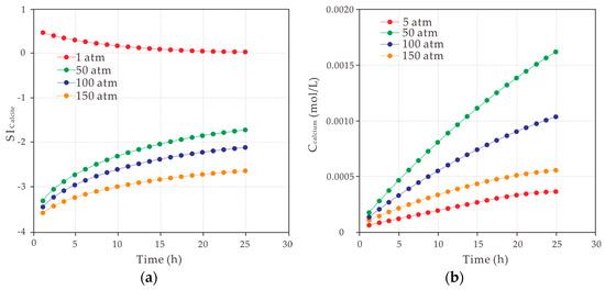 Saturation indexes (SI) for concentrations of calcite and calcium at different pressures: (a) SIcalcite and (b) Ccalcium.