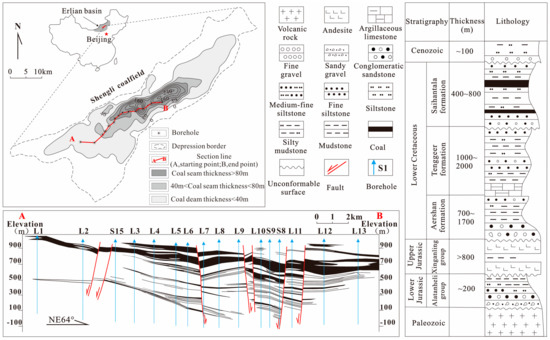 The Shengli coalfield investigated in this study is located in the Jiergalangtu depression in the southeast of the Erlian Basin, and its administrative division belongs to Xilin Hot in Inner Mongolia (Figure 1). The Shengli coalfield, which is bounded by faults to the northwest and southeast, and by an erosion boundary to the northeast and southwest, is a half-graben with increased sediment thickness in the northwest (Figure 1). The coal-bearing stratum is the lower Cretaceous Saihantala Formation. Lithologically, the Saihantala Formation is composed of conglomerate, sandstone, siltstone, carbonaceous mudstone, and thick coal, and the compositional and textural maturities of sandstone and conglomerate are relatively low. The sandstone of the Saihantala Formation is mainly composed of arkose and litharenite with some poorly sorted and rounded gravel [32]. The conglomerate includes multiple size classes and is characterized by matrix-supported grains [32]. The low compositional and textural maturities indicate relatively short transportation and closeness to the source. The sedimentary facies were interpreted to include fan deltaic plain and front, braided river deltaic plain and front, and shore-shallow lake [29].