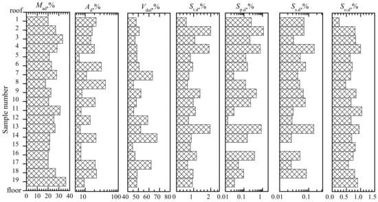 The results of the proximate and sulfur analyses of the 19 samples are shown in Table 1 and Figure 2. The proximate analysis results showed that the studied coals displayed a low to high ash yield which ranged from 6.6 wt % to 41.0 wt % (average = 24.9 wt %). The air-dried moisture content (Mad) ranged from 17.8 wt % to 36.5 wt % (average = 16.0 wt %). The dried ash-free volatile matter (VMdaf) ranged from 44.6 wt % to 67.6 wt % (average = 51.5 wt %). The dried fixed carbon content (FCd) ranged from 44.6 wt % to 51.3 wt % (average = 40.7 wt %). The total sulfur content ranged from 0.64 wt % to 2.00 wt % (average = 1.12 wt %). The contents of pyrite, sulfate, and organic sulfur ranged from 0 wt % to 1.12 wt % (average = 0.29 wt %), 0 wt % to 0.15 wt % (average = 0.057 wt %), and 0.47 wt % to 1.05 wt % (average = 0.77 wt %), respectively. The δ13C values ranged from −23.42‰ to −21.83‰ (average = −22.53‰; Table 1).