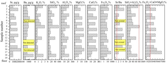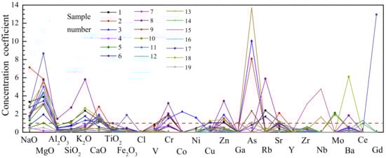 The Cl, Ti, V, Cr, Co, Ni, Cu, Ga, As, Br, Rb, Y, Nb, Mo, Ru, Pd, Ce, and Gd elements were rare and occurred in several coal samples ranging from 3.7–730 ppm (Table 2). In contrast, the other elements, including P, S, Mn, Zn, Sr, Ba, and oxides including Na2O, MgO, Al2O3, SiO2, K2O, CaO, TiO2, and Fe2O3, were widely developed in various coal samples. The contents of P, S, Mn, Zn, Sr, Zr, and Ba ranged from 180 to 6610 ppm, 9220 to 122,400 ppm, 50 to 3810 ppm, 30 to 544 ppm, 105 to 2374 ppm, 10 to 3782 ppm, and 240 to 4420 ppm, respectively. The contents of Na2O, MgO, Al2O3, SiO2, K2O, CaO, TiO2 and Fe2O3 ranged from 0.7–7.0%, 0.2–12.8%, 2.5–21.6%, 4.4–56.3%, 0.3–2.7%, 1.1–25.5%, 0.1–0.8%, and 0.6–45.8%, respectively. Figure 3 further shows that most of the coal samples from the Shengli coalfield were enriched with Na2O, MgO, K2O, and CaO, and several samples were enriched with Cr, Co, Ni, Cu, Zn, As, Rb, Sr, Nb, Mo, Ba, and Gd, but were depleted in Al2O3, SiO2, TiO2, Fe2O3, Cl, V, Co, Ga, Y, and Ce when compared to those from the average Chinese coals [53,54].