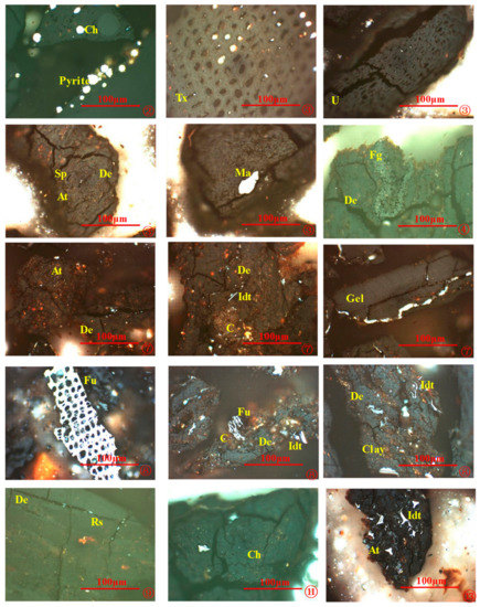 Macerals photos (the sample number is given at the lower right corner in each photo as red circled digit); Tx, Textinite; U, Ulminite; At, Attrinite; De, Densinite; Gh, Gelohuminite; Ch, Corpohuminite; Fu, Fusinite; Ma, Macrinite; Idt, Inertodetrinite; Sp, Sporinite; Cu, Cutinite; Rs, Resinite.