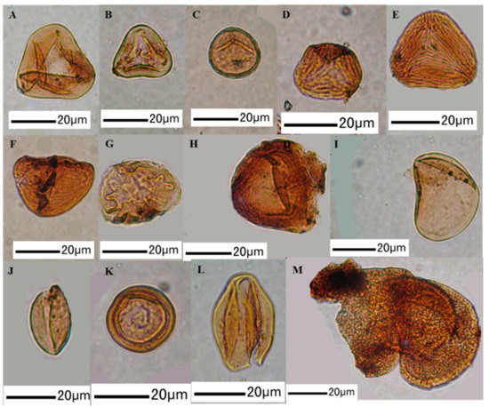 Sporomorphs of the coal samples (A–H) are from the No. 3 coal sample; (I) is from No.5 coal sample; (J–K) are from the No. 8 coal sample; (L) and (M) are from the No. 10 and 12 coal samples, respectively: (A) Cyathidites minor; (B) Gleicheniidites senoicus; (C) Leptolepidites psarosus; (D) Cicatricosisporites minor; (E) Cictricosisporites australiensis; (F) Cicatricosisporites amalocostriatus; (G) Kuylisporites lunaris; (H) Bayanhuasporites membranceus; (I) Laevigatosporites ovatus; (J) Cycadopites acerrimus; (K) Classopollisannulatus; (L) Eucommiidites troedsoni; and (M) Podocarpidites sp from the No. 12 coal sample.
