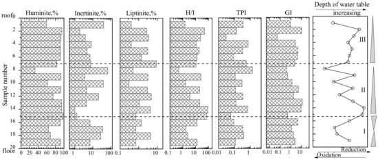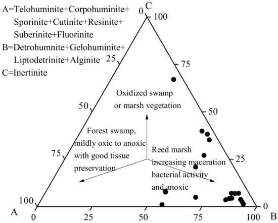 Based on the critical facies precursors of maceral subgroups [3], samples of the No. 5 coal seam lacking telohuminite and rich in detrohuminite were characterized by the dominance of herbaceous plants in a lakeshore (e.g., reed-mire). Mukhopadhyay developed a diagram to identify the origin of the main vegetation type in the palaeomire, and oxic/anoxic conditions prevailed during peat accumulation [56]. Figure 6 shows that the studied coal samples were mostly projected on the area closer to apex B; only the no. 8 samples did not follow this trend due to higher inertinite contents. This finding indicates that the peat accumulated under anoxic conditions associated with bacterial activity, occasionally alternating with partially oxidative ones. Additionally, the scattered distribution in the ternary plot inferred that the groundwater level during peat accumulation generally seems to have been highly fluctuating in the palaeomire.