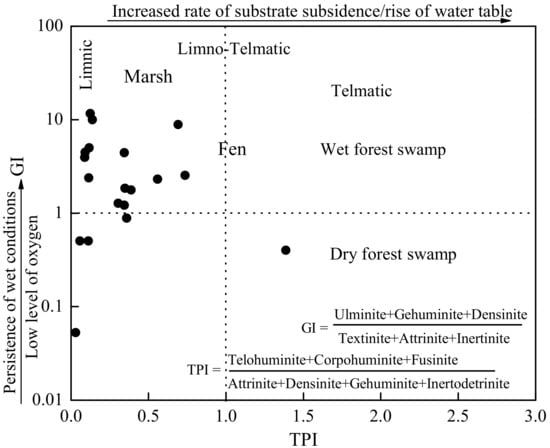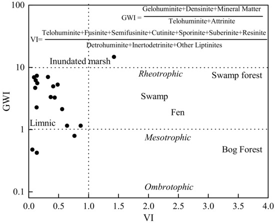 The TPI, GI, GWI, and VI calculated from the maceral analysis were also adopted to interpret the paleo-environment of peat accumulation. These indices were originally developed in studies on bituminous coals in Australia and Canada [5,7]. In this study, the indices modified by Kalaitzidis et al. were adopted to assess the coal facies and depositional environments of the Shengli coals [9,57]. The low TPI (0.03–1.39) and VI (0.05–1.42) values suggested that the herbaceous vegetation was predominant, with relatively low levels of oxygen and low preservation of organic matter during accumulation, except sample no. 8 (Figure 7 and Figure 8) [58]. Moderate and variable GI (0.05–11.59) and GWI (0.07–14.72) values mainly inferred a moderate influence of groundwater during accumulation; thus, mesotrophic to rheotrophic conditions with a relatively high supply of inorganic material and fluctuating water table dominated the coal deposit. This conclusion was further verified by the relatively high ash yields of the coals (Table 1). As stated above, the palaeomires were developed in limnic to limno-telmatic environments, and the high inertinite contents in several layers were presumably related to oxidation periods, such as a drier climate and/or a very low water-table.