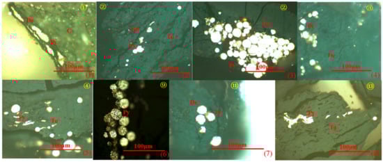 Occurrence of pyrite in different coal samples (the number in the yellow circle is the sample number, and the number in the red parenthesis is a series number of the photo; (1) vein pyrite, filled in desinite (De) surrounded by clay; (2) framboidal pyrite, distributed in texto-ulminite (Tu); (3) framboidal pyrite, distributed in groups around levigelinite (Lg) and texto-ulminite (Tu); (4) framboidal pyrite, distributed in desinite (De); (5) framboidal and vein pyrites distributed in texto-ulminite (Tu); (6) framboidal pyrite, distributed in groups in texto-ulminite (Tu); (7) framboidal pyrite, distributed in desinite (De); and (8) xenomorphic pyrite, filled in the cell of texto-ulminite (Tu)).