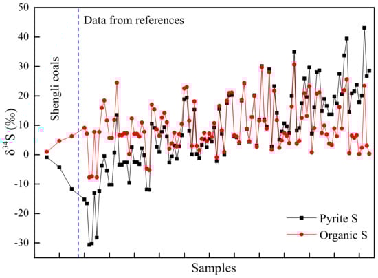 Figure 10 shows that the differences between organic δ34S and pyritic δ34S had large variations by comparing data from China, USA, Australia, and Japan [70,71,72,73,74,75,76,77]. Organic δ34S in 70 sets of data from the total 116 data, including the three investigated coals, were higher than pyritic δ34S, and 48 sets of data were the opposite, with the remaining one being equal (Figure 10). Several researchers have stated that pyrite has lower δ34S values as a result of isotopic fractionation accompanying microbial sulfate reduction [67,69]. Namely, syngeneic pyritic δ34S values should be lower or equal to those of syngeneic organic sulfur. This finding further verified that the pyrite in the studied coal was probably syngeneic and formed through microbial sulfate reduction. In addition, the contrasting highly-variable pyritic δ34S values implied that there were probably several generations of pyrite formation during the different stages of coal formation due to the possibly inhomogeneous distribution of sulfate-reducing bacteria (Figure 10) [78].
