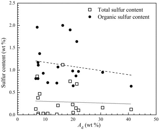 Proximate analysis, including moisture, ash, volatile matter, and fixed carbon was performed according to Chinese standard GB/T 212-2008, consistent with ISO 11722:1999, ISO 1171:1997, and ISO 562:1998, except that the attained temperature was 900 °C within three minutes in volatile yield determination. The total sulfur content in air-dried basis (St,ad) was determined by the coulometric titration method according to the Chinese standard GB/T 214-2007. An air-dried coal sample (0.05 ± 0.005 g) with a grain size less than 0.2 mm was weighed (accuracy of 0.0002 g) into a ceramic boat and covered with thin layer of tungsten trioxide, then completely oxidized into sulfur oxides at a temperature of 1150 °C with a catalyst. The SO2 was absorbed by the potassium iodide solution, the iodine produced by electrolysis of potassium iodide solution was titrated, and, finally, St,ad was calibrated from the amount of electricity consumed by the electrolysis. The form of sulfur was determined by GB/T 215-2008. The sulfate sulfur in air-dried basis content (Ss,ad) was determined by the following procedures: First, 1 ± 0.1 g (accuracy of 0.0002 g) of air-dried coal sample with a grain size less than 0.2 mm was boiled in HCl, and the sulfate from coal was leached and converted to a barium sulfate (BaSO4) precipitate. Finally, Ss,ad was calculated according to the mass of BaSO4. The pyritic sulfur in air-dried basis content (Sp,ad) was determined by the oxidation method. After the extraction of iron from non-iron sulfide in the coal sample by HCl, the coal sample was further leached with dilute nitric acid, and the iron in the nitric acid leaching solution was titrated by a standard potassium dichromate solution. Accordingly, Sp,ad was calculated by the iron mass. Finally, the organic sulfur content in air-dried basis (So,ad) was calculated by St,ad − (St,ad + St,ad).