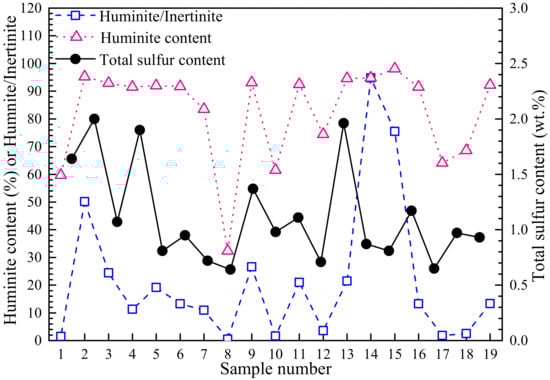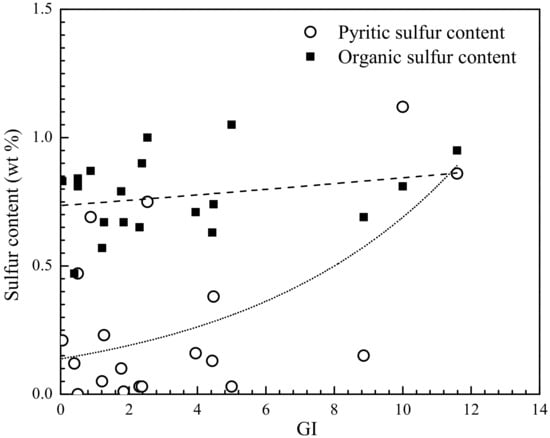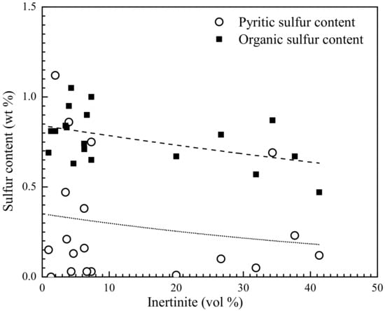 Sulfate brought in by marine and/or sulfate-rich groundwater might have played a key role in the origins of sulfur in coal and is believed to be geochemically stable; thus, sulfate is bacterially reduced to form H2S [69,101]. The hydrogen sulfide thus generated may react with iron to form iron sulfide species and with organic matter to form organosulfur constituents [83]. Accordingly, specific pH and anaerobic conditions required by sulfate-reducing bacteria are very important to H2S generation, thus enhancing the sulfur content [69]. Figure 14 and Figure 15 show that the organic and pyritic sulfur contents were positively related to the huminite content and GI and negatively related to the inertinite content. The high huminite content and GI, but low telohuminite content, indicated the reducing and alkalescent environment which was suited for bacterial sulfate reduction and H2S. Thus, more sulfur was subsequently fixed in coal [102]. Microscopic analysis further verified that most of the pyrite occurred in association with huminite (Figure 9). Conversely, the high inertinite represents an aerobic environment that is not appropriate for fixed sulfur in coal (Figure 16).