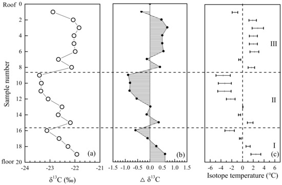(a) Vertical carbon isotope record of lignite (‰ vs. PDB); (b) normalized record (line) ∆δ13C given as δ13C minus the average value of the entire coal seam; and (c) +0.39‰13C/°C was adopted in the lowest temperature change calculation obtained by [108] and +0.18‰13C/°C used in highest temperature changes found by [111].