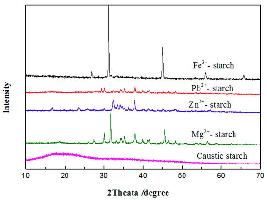 Figure 1 shows the XRD spectra of the MSC and caustic starch. It can be seen that the caustic starch presents an amorphous state. In the Fe3+-starch spectrum the diffraction peaks nearing 26.78° and 55.95° can be attributed to the characteristic of β-FeOOH [19], indicating the presence of β-FeOOH crystal structure in the Fe3+-starch. Then, in the spectrum of Pb2+-starch, the characteristic diffraction peak of (PbCO3)2·Pb(OH)2 and the peak of Pb2O3 were observed at 34.18°, 26.78° and 55.95°, respectively, and these might be due to the decomposition of Pb(OH)2 and its reaction with CO2 during the crystallization of the Pb2+-starch. However, there are no characteristic peaks of Zn(OH)2 found in the Zn2+-starch spectrum; only two characteristic peaks at 36.25° and 36.53° of ZnO were observed. Finally, it was found in the Mg2+-starch spectrum, the bands around 38.04° and 58.76° can be assigned as the characteristics of Mg(OH)2, and MgCO3 was confirmed at 33.15° and 46.53°. These suggested that some metal oxides or carbonates were created during the crystallization of the MSC, indirectly reflecting the possible presence of metallic hydroxides or hydroxyl complexes in the MSC.