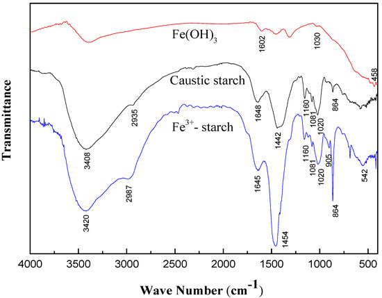 Figure 2 presents the FTIR result of the Fe3+-starch. It can be inferred that peaks at 1645 cm−1 and 1016 cm−1 can be assigned as the C=O stretching vibration and the O–H bending vibration, respectively, and the bands around 1160 cm−1 and 1081 cm−1 are attributed to the C–O stretching vibration, demonstrating the characteristics of starch. Then, the peak of Fe–O stretching vibration [10], which was found at 905 cm−1, might be due to the adsorption band of β-FeOOH [20]. Meanwhile, in contrast to the FTIR spectrum of Fe(OH)3 colloids seen in Figure 2, it was found that the Fe(OH)3 could not represent the characteristic component of the Fe3+-starch. These highlighted the presence of the hydrophilic metallic hydroxide (β-FeOOH) which agreed with the XRD results in Figure 1.