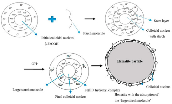 Based on the analyses mentioned above, a molecular model could be proposed as follows. To take the Fe3+-starch as an example, starch molecules adsorbed initially on the colloid nucleus (β-FeOOH), resulting in a stable “compound molecule” composed of the nucleus and covering of hydrophilic metallic hydroxyl complexes, together with the starch molecules. The colloid nucleus exhibited a low concentration of FeO+ ions on its surface at low alkali pH, and then grew into a larger nucleus at high alkali pH. Therefore, some OH- and starch molecules would adsorb into the stern layer of the colloid nucleus, forming a “large starch molecule”, surprisingly leading to a particular adsorption effect on iron particles with the aid of the bridging adsorption of the starch and the H-bonding adsorption of the hydrophilic metallic hydroxyl complexes. The proposed model of the MSC (Fe3+-starch) is given in Figure 4.