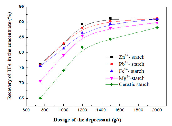 Figure 5 and Table 2 indicated that the flotation recovery of iron minerals increased with the increasing depressant dosage, but the iron recovery of depressant MSC was obviously higher than the caustic starch while adding the same concentration of starch. The flotation recovery using MSC as the depressant was slightly better than that using the same dosage of caustic starch, demonstrating the depressing ability of MSC (Fe3+, Zn2+, Pb2+ and Mg2+) on the iron minerals were higher than the caustic starch, and amongst them, the order of depressing ability was summarized as: Zn2+-starch > Pb2+-starch > Fe3+-starch > Mg2+-starch > caustic starch. In addition, it was also found that the Fe3+-starch displayed the best flotation selectivity among the MSC depressors.