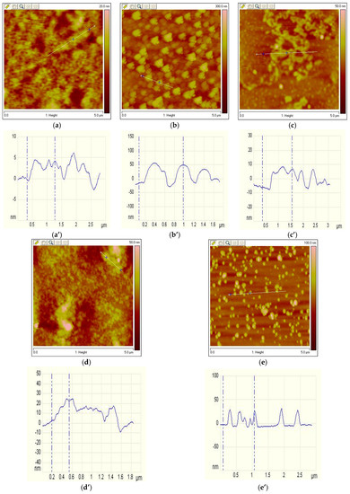 Figure 6. Effect of 120 mg/L MSC on the adsorption characteristic: (a,a’) caustic starch; (b,b’) Fe3+ starch; (c,c’) Zn2+ starch; (d,d’) Pb2+ starch; (e,e’) Mg2+ starch.