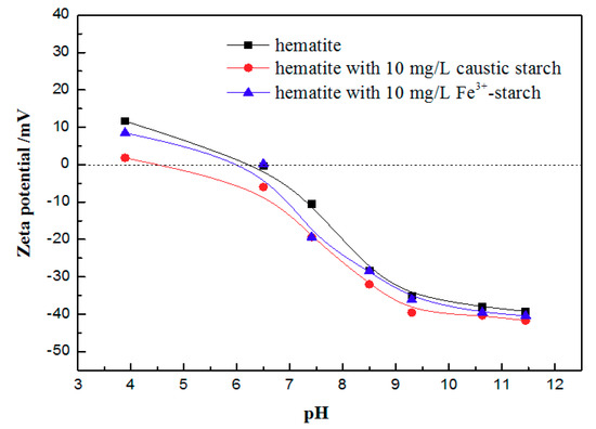 As shown in Figure 7, both the MSC and caustic starch were negatively charged at neutral and alkali pH, but the MSC presents a weaker electronegativity than the caustic starch at the same pH value, and amongst the results of the MSC, the Fe3+-starch exhibits the lowest negative charge while the Zn2+-starch displays the largest negative charge. Therefore, it can be also revealed that the MSC (especially the Fe3+-starch) could adsorb onto iron minerals more easily than the caustic starch while in some cases iron minerals were negatively charged. Figure 8 found that the iso-electric point (iep) of hematite is around pH 6.5 and the hematite has a negative potential at neutral and alkali pH. Meanwhile, the absolute value of hematite potential was raised after adding a certain concentration of caustic starch, however, was weaker by using the Fe3+-starch. In this case, therefore, the adsorption of Fe3+-starch on hematite could facilitate agglomeration of particles more easily than the caustic starch, resulting in a good flotation effect.