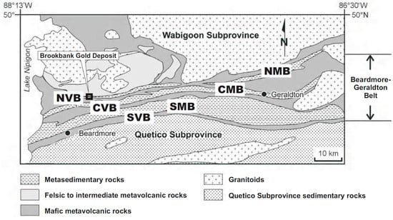 Geology of the Beardmore–Geraldton greenstone belt, with the location of the Brookbank gold deposit. NVB = northern volcanic belt; NMB = northern metasedimentary belt; CVB = central volcanic belt; CMB = central metasedimentary belt; SMB = southern metasedimentary belt; SVB = southern volcanic belt. Modified after [22]. Reproduced with permission from the Ontario Geological Survey, published by the Queen’s Printer for Ontario.