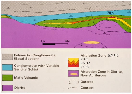 The availability of drill core for this study provided a means of examination of the ores and alteration at depth, with particular emphasis on the nature of the ore-depositing solution by means of fluid inclusion analysis. A comprehensive study of surface samples treated the petrology of the host rocks, alteration, structure, geochemistry and ore mineralogy [14]. The Brookbank deposit occurs within a shear zone, the Brookbank shear zone, a splay of the Paint Lake deformation zone (Figure 2). The shear zone strikes N70W and dips steeply to the south, roughly parallel to bedding (Figure 3). The Cherbourg Zone lies 900 m to the west of the Brookbank along a splay from the shear zone. The shear hosting the Cherbourg Zone strikes N30E, also dipping steeply. Younging directions in the host rocks at Brookbank face north, indicating that bedding is overturned [20,21].