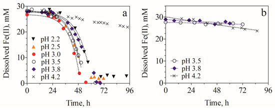 Fe(II) oxidation kinetics in cultures of strain GJ-E10 (a) and in an abiotic medium (b) under different pH conditions at 25 °C. The dashed lines show the nonlinear regression of the data to Equation (1), (a) and Equation (2), (b).