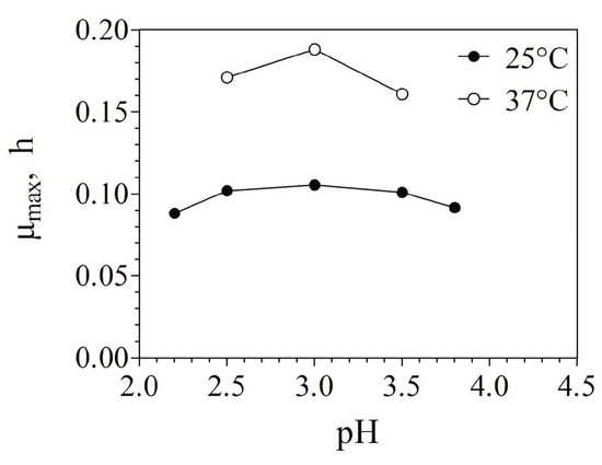 Increasing the culture temperature to 37 °C resulted in an increase in the Fe(II) oxidation rate (Table S1 and Figure S1). Because abiotic oxidation in the non-inoculated medium was still minor in the pH range of 2.5 to 3.5 (Table S2), the increase in the oxidation rate likely resulted from the enhanced microbial growth. In that pH range, μmax values were 1.6 to 1.8 times those that were obtained for cultures at 25 °C (Figure 2). These results indicated that the reaction catalyzed by GJ-E10 cells was fast and contributed predominantly to the Fe(II) oxidation and precipitation of solids at least under the conditions excluding 25 °C and pH 4.2.