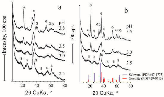 X-ray diffraction (XRD) patterns of biogenic iron oxide minerals formed in cultures at different pH levels at 25 °C (a) and 37 °C (b). ‘G’ and ‘S’ represent the diffraction of goethite and schwertmannite, respectively.