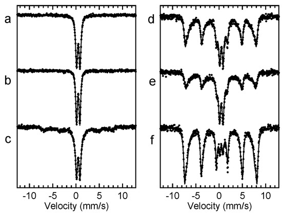 Cryogenic Mössbauer spectra at 100 K of biogenic iron oxide minerals formed in cultures at pH 2.5 (a); 3.0 (b); 3.5 (c); and 3.8 (d) at 25 °C and cultures at pH 3.0 (e) and 3.5 (f) at 37 °C. The spectra were fitted to a linear combination of normalized spectra (solid curves) of schwertmannite (sch) and goethite (goet): (a), 100% sch; (b), 100% sch; (c), 76% sch and 24% goet; (d), 23% sch and 77% goet; (e), 36% sch and 64% goet; (f), 9.5% sch and 90.5% goet.