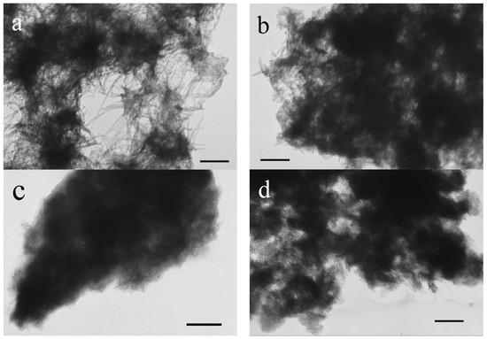 Bigham et al. [28] demonstrated the occurrence of mixed phases consisting of schwertmannite and goethite in acidic A. ferrooxidans cultures at 24 °C. Their culture grown at pH 3.0 yielded only a schwertmannite phase. In contrast, increasing the medium pH to 3.3 and 3.6 resulted in the concomitant formation of goethite, which was suggested to comprise ~12% and 42% of total solid iron, respectively, by semiquantitative analyses [28]. In the present study, our XRD (Figure 3) and Mössbauer spectroscopic data (Figure 4) were consistent with the previous report, and first indicated that these two phases were distinctively formed via control of the growth conditions of the acidophilic Fe(II) oxidizer. Although only schwertmannite formed in the cultures grown at 25 °C and pH 3.0, goethite phases appeared at pH 3.5 and 3.8 (Figure 3). Validity of these XRD patterns was confirmed in two or three independent bioreactor experiments. The formation ratio of schwertmannite to goethite could be evaluated quantitatively by Mössbauer spectroscopy (Figure 4 and Table 1). It is known that the Mössbauer spectrum of schwertmannite has a paramagnetic doublet pattern at temperatures down to 90 K [35], while the magnetic sextet pattern appears for goethite though the goethite nanoparticles show a superparamagnetic doublet pattern at room temperature [36]. The crystallite sizes of goethite calculated from XRD peaks in Figure 3 were 10.3–22.7 nm (Table 1). To suppress the superparamagnetic behaviour of goethite nanoparticles, cryogenic Mössbauer measurements were performed at 100 K. Therefore, the relative area intensity of magnetic components in the Mössbauer spectra yielded the formation ratio of goethite, which accounted for 24% and 77% of total iron precipitates at pH 3.5 and 3.8 at 25 °C, respectively. The goethite formation was enhanced by increasing the culture temperature to 37 °C, and a 90% pure goethite phase was obtained at pH 3.5 (Figure 4). Again, under these conditions, the biological Fe(II) oxidation contributed mainly to the mineral formation. The TEM analysis revealed that the emergence of a goethite phase in the products resulted in the morphological change of whisker or filamentous structures typical for schwertmannite into very fine particulate forms with diameters of ~50 nm (Figure 5), consistent with the estimated crystallite size based on XRD. Similar structures of the mixed products in A. ferrooxidans cultures were reported [28]. The 90% pure goethite that was obtained at pH 3.5 and 37 °C had a BET-specific surface area of 133 m2·g−1, while the schwertmannite phase at pH 3.0 and 25 °C showed 30 m2·g−1.