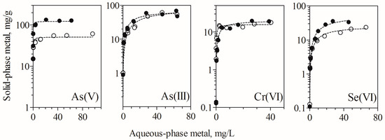 Our biogenic goethite adsorbed As(III) most effectively (Figure 6 and Table S3), and the maximum sorption capacity was estimated to be 126 mmolAs·molFe−1 at pH 4. The sorption capacity values for As(V), Se(VI), and Cr(VI) were 79, 39, and 35 mmol·molFe−1, respectively. It is most likely that the large capacity results from the high specific surface area. In goethite, the surface site where ligand exchange or complexation occurs is an important determinant of metal sorption capacity [18]. Although naturally occurring and synthetic goethite phases show a wide range of As(V) sorption capacity values per unit weight, they also show comparable capacity per unit surface area (3–5 μmol·m−2) at pH 3–7 (Figure S2; data from Asta et al. [39]), indicating a higher sorption ability in the nano-sized particulate phase. The importance of the surface area for the sorption capacity of goethite preparations can also be demonstrated for Se(VI). The goethite preparation with low specific surface area (2 m2·g−1) showed a maximum Se(VI) capacity of 1.1 μmol·m−2 [40], although the use of a high-ionic strength medium (0.1 M NaCl) may somewhat lower the sorption capability. Given the specific surface area (133 m2·g−1) and the Se(VI) sorption capacity (2.5 μmol·m−2), the biogenic goethite obtained in this study can adsorb a large amount of Se(VI) per unit weight.