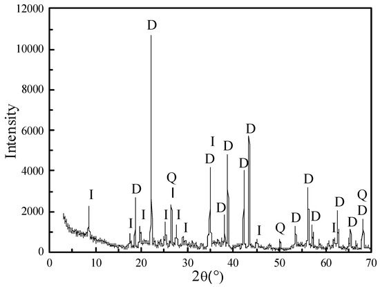 X-ray diffraction (XRD) pattern of the bauxite sample (D, diaspore; Q, quartz; I, illite).