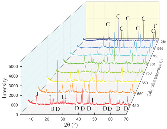 From Figure 5, it can be seen that the mineral phase of the bauxite calcined at 450 °C does not change compared with the raw sample. As the calcination temperature rises, the new phase of corundum (α-Al2O3) appears in the sample, and the diaspore diffraction peaks disappear above 450 °C. When the temperature rises to 1050 °C, the illite is not observed, and the main phase of the solid sample is corundum due to the high temperature sintering. As reported in [28], above 1100 °C, illite begins to transform into amorphous substance and mullite, while there is no mullite phase discernable in the XRD pattern. The reason for this most likely is that the content of illite is low in the bauxite and only part of illite can transform into mullite.