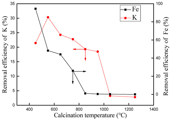 The effect of calcination temperature is studied with leaching in 1.2 mol/L sulfuric acid solution according to the liquid/solid (L/S) of 9 mL/g at a reaction temperature of 70 °C for 2 h, and the results are presented in Figure 6. It can be seen that calcination temperature has a significant effect on removal efficiency. The removal efficiency of Fe drops sharply from 94.42 to 1.03% when the calcination temperature increases from 450 to 850 °C. Above 850 °C, it keeps below 1.00% until becoming around 0 (not detected) at 1250 °C. The removal efficiency of K increases from 21.46% at 450 °C to 30.32% at 550 °C, reaching the maximum value. Beyond 550 °C, it begins to decrease to approximately 3.00% at 1250 °C.