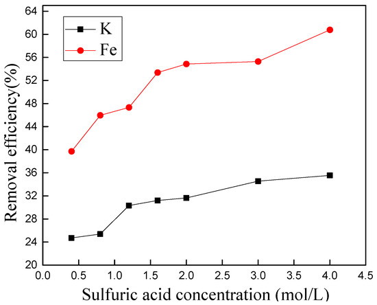 As presented in Figure 7, the removal efficiency of potassium and iron increases gradually with the increasing acid concentration, whose efficiency is raised from 24.71 to 35.54% and 39.71 to 60.78% as the acid concentration is varied from 0.4 mol/L to 4 mol/L, respectively. Higher acid concentration can conduct a strong attack on the minerals and destroy its structure. Besides, for the leaching process, higher acid concentration increases the H+ activity [31], which may enhance the ion exchange capacity between metal ion and H+, resulting in increasing potassium and iron removal efficiency.