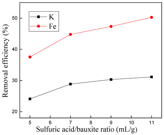 To observe the effect of liquid/solid ratio on the removal efficiency, the experiments were carried out with four ratio levels ranging from 5 to 11 mL/g at acid concentration of 1.2 mol/L, 70 °C for 2 h. The results plotted in Figure 9 showed that the removal efficiency of K and Fe increases with the increase of the sulfuric acid-to-bauxite ratio. This can be explained that higher acid/bauxite ratio supplies more sulfuric acid to leach the potassium and iron. In addition, higher ratio can reduce reaction system viscosity of reactants for improving well mixing and promote diffusion. When the ratio varies from 5 to 11 mL/g, the removal efficiency of potassium and iron only increases from 24.12% to 31.14% and 37.55% to 50.26%, respectively, which does not obviously increase the extent of removing. This reveals that the amount of sulfuric acid is adequate to leach potassium and iron when the ratio exceeds 7 mL/g. Taking the lower acid concentration (1.2 mol/L) into account, the ratio of 9 mL/g is found to be the optimum for leaching.