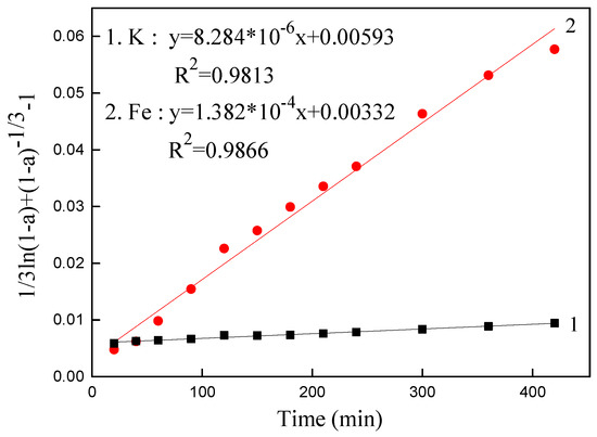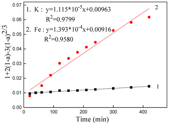 The experimental data of Figure 10 are simulated, and the plots of Equations (2) and (3) versus time are presented in Figure 11 and Figure 12, respectively. It can be found from Figure 12 that Equation (3) can better describe the leaching process of potassium and iron because the data in Figure 12 are linear with a higher correlation coefficients (R2) compared to Figure 11. The results indicate that the kinetics of the removal of potassium and iron in sulfuric acid is controlled by both the diffusion through solid layer and interface transfer. The rate constant (k2) and intercept are obtained from Figure 12, and the kinetics models for removing potassium and iron are respectively concluded by Equations (4) and (5).