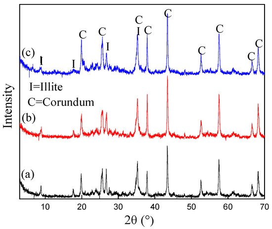 The XRD patterns of the roasted bauxites and the leach residues are observed in Figure 13. It can be seen that a, b and c have the same crystal phases with illite and corundum. The XRD results indicated that the illite in the bauxite has a very stable crystal structure, which was not destroyed even by the 4 mol/L sulfuric acid attack. The stable crystal structure should be responsible for the lower potassium removal efficiency.