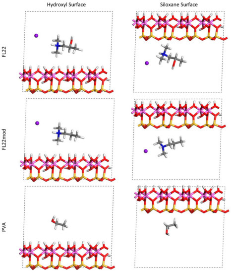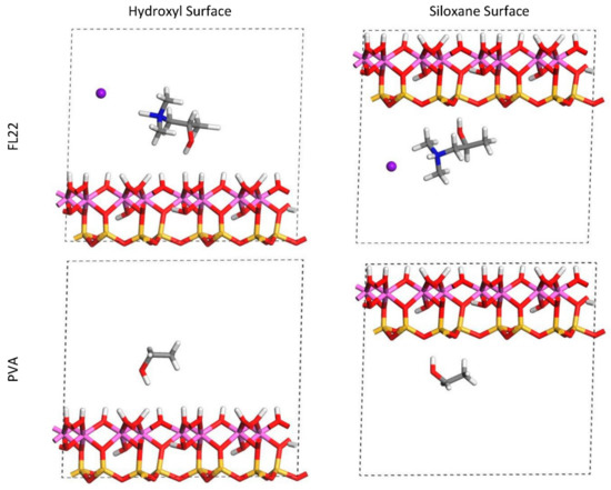 For FL22 and FL22mod, four models were created, with each monomer positioned approximately 4.5 Å from the hydroxyl surface and, separately, the siloxane surface, each of these with Cl− and separately, with a background charge. As PVA has no associated charged ion, this monomer was placed at 4.5 Å from the hydroxyl and siloxane surfaces in the absence of Cl− and charge. FL22 and PVA contain hydroxyl groups with the potential to form hydrogen bonds with the basal surfaces of the clay. This was tested by creating two scenarios labelled orientation 1 (o1) and orientation 2 (o2), where in o1 the hydroxyl groups point away from the basal surface, and in o2 the hydroxyl groups point towards the basal surface. The initial configurations for these monomers are shown in Figure 1 and Figure 2. The atomic positions of these models were then allowed to relax, in accordance with the convergence criteria described in Section 2.7.